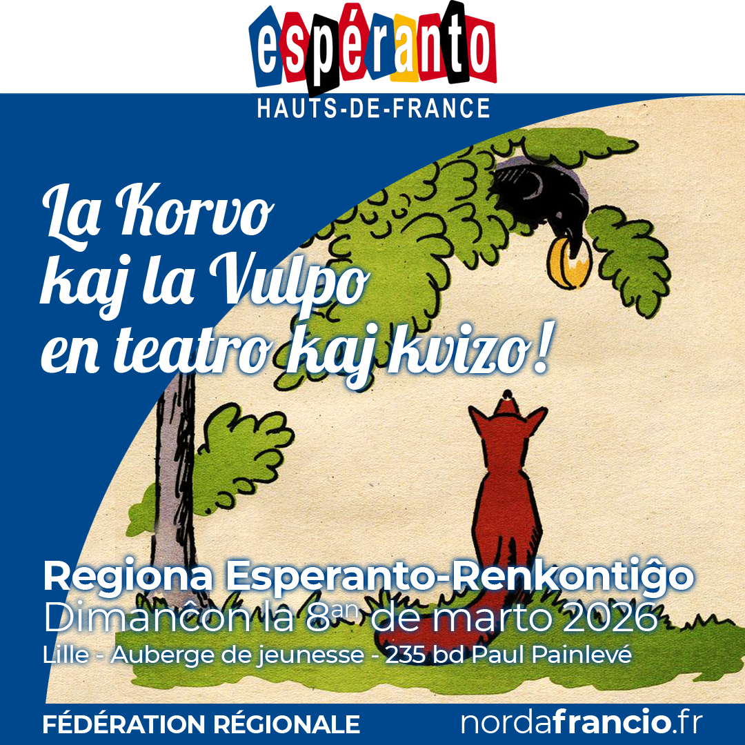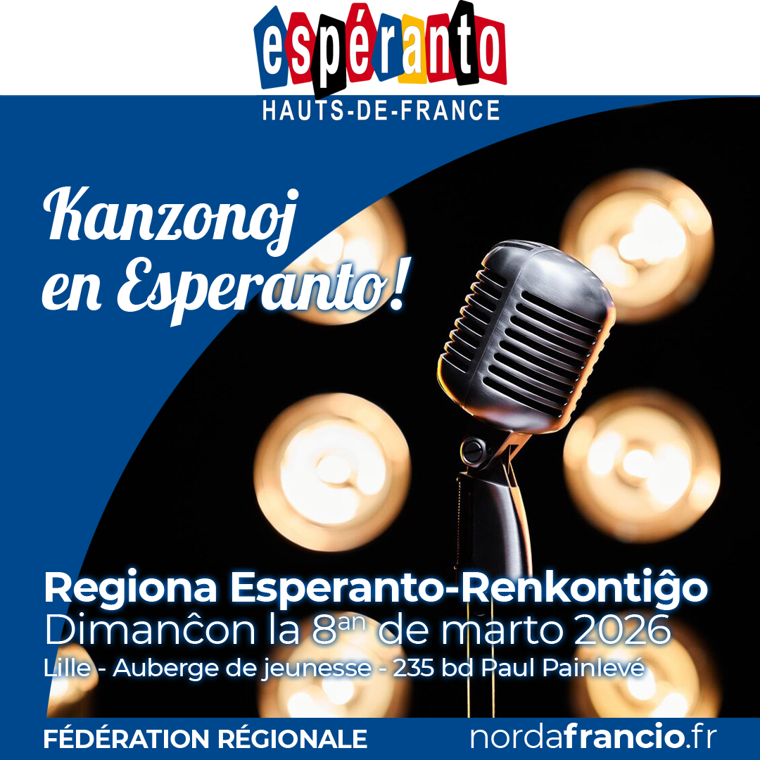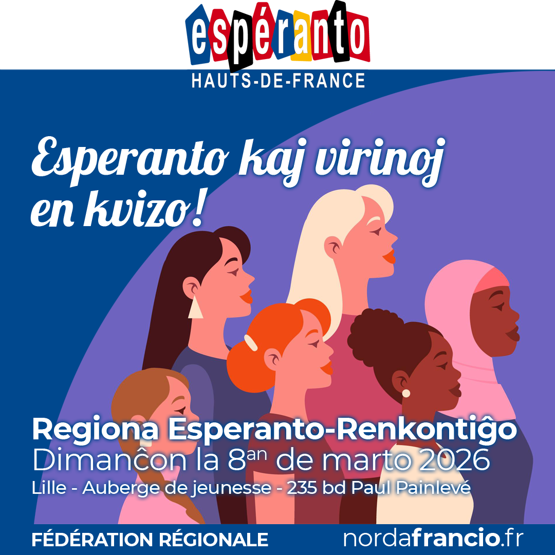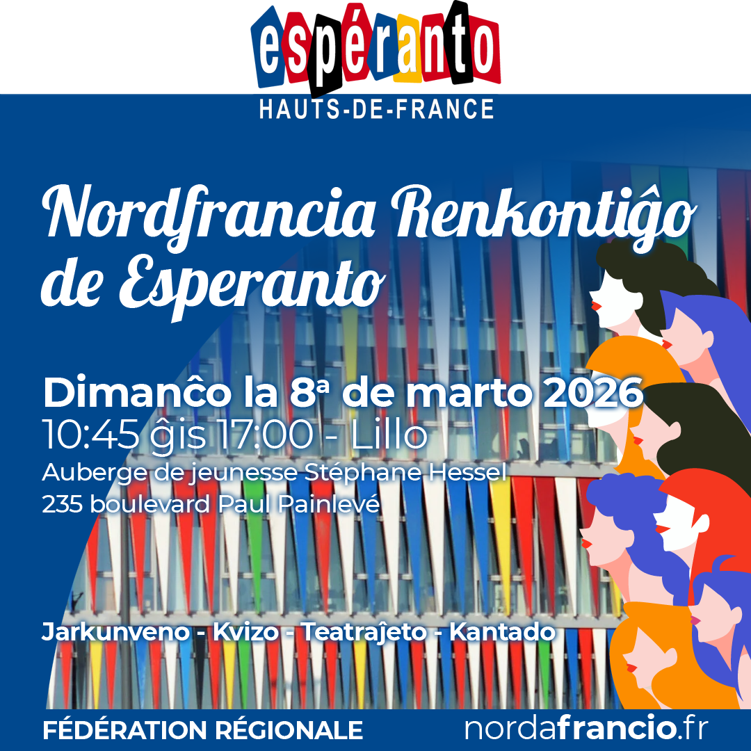 Ĉiuj esperantistoj el Norda Francio, Belgio kaj pli for estis invititaj al nia regiona renkontiĝo de Esperanto dimanĉon la 8an de marto 2026 de 10:45 ĝis 17:00 en Lillo!