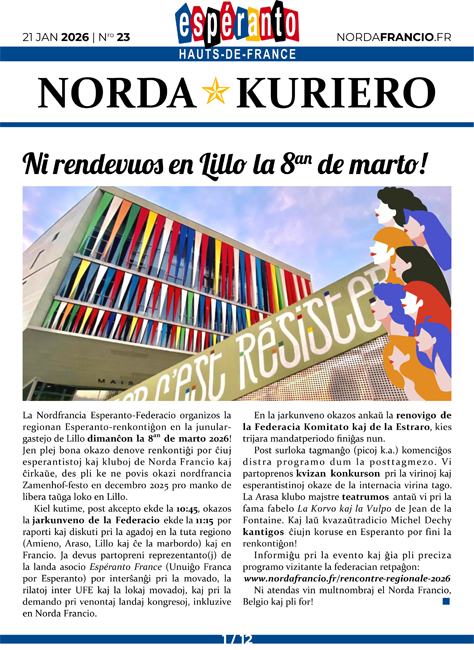 C’est ce 21 janvier 2026 que vient d’être publié le numéro 23 de Norda Kuriero, le bulletin d’information électronique de la fédération régionale Espéranto Hauts-de-France ! Il met l’accent sur la rencontre régionale d’espéranto du 8 mars 2026 et sur l’activité des clubs de la région. Cliquez ici pour le lire !